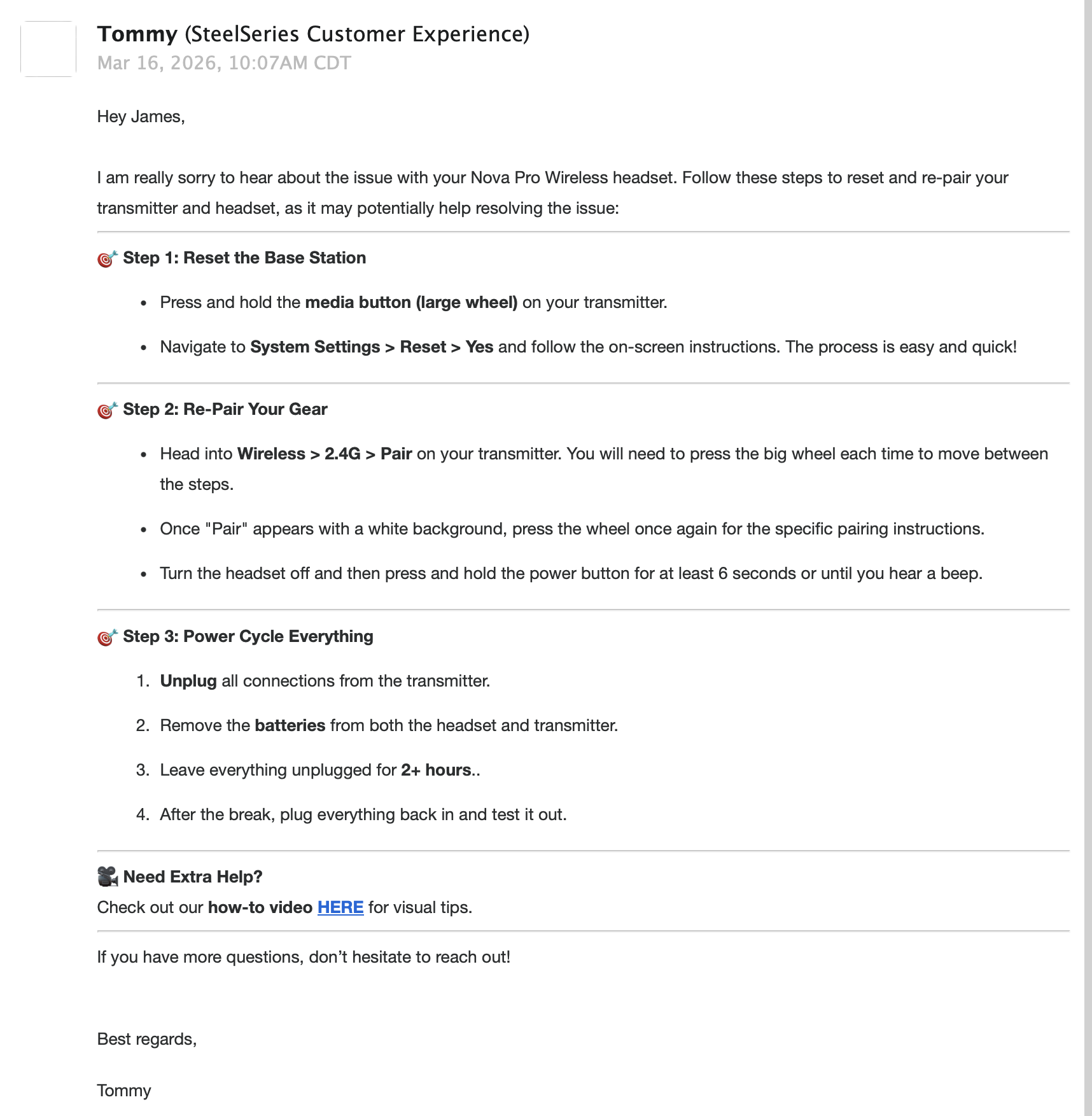 I am really sorry to hear about the issue with your Nova Pro Wireless headset. Follow these steps to reset and re-pair your transmitter and headset, as it may potentially help resolving the issue: