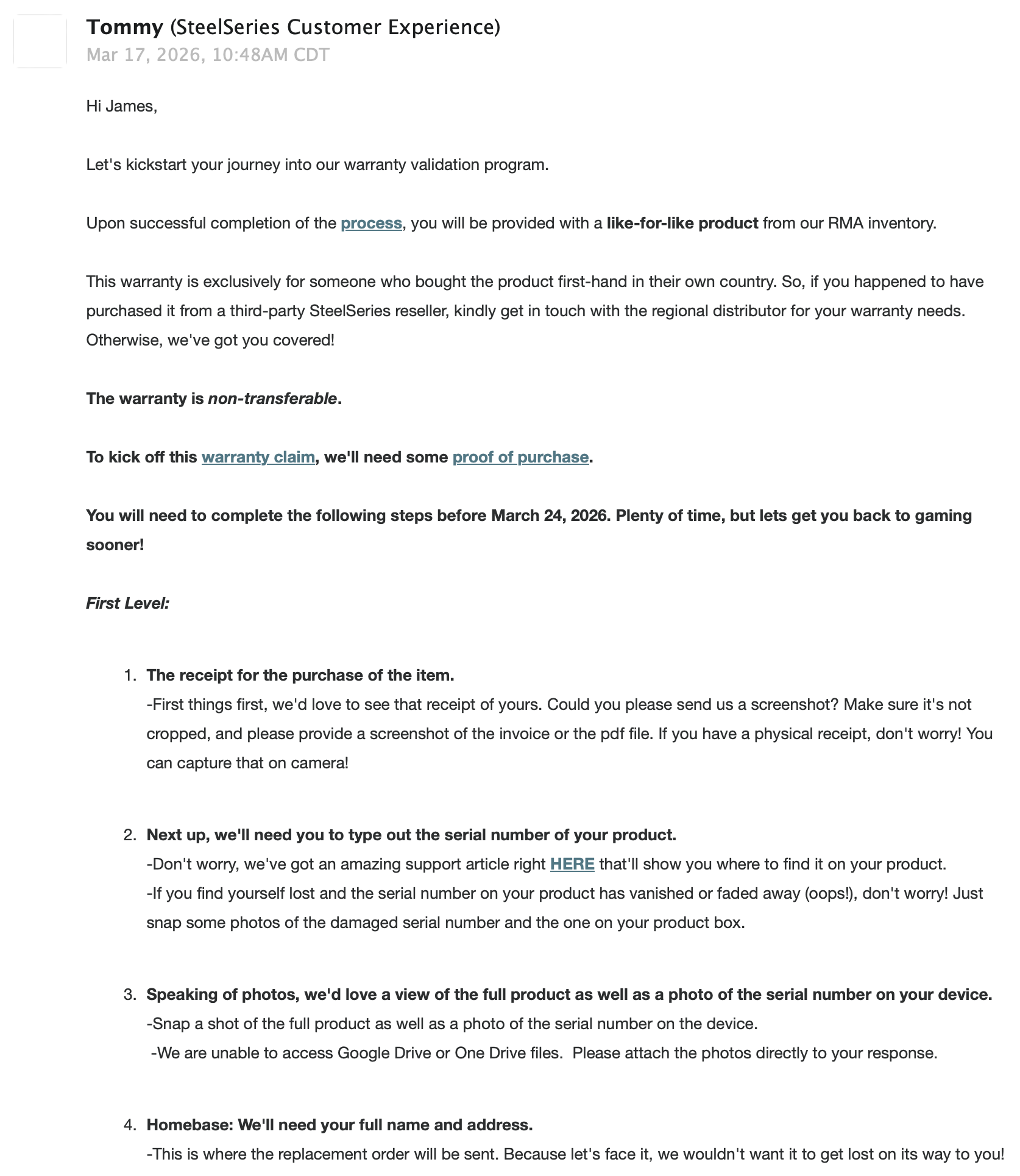 This seemed to get us over the primary hurdles and into the phase where we get actual support. The response from them was to ask for proof of purchase and the address to ship the replacement to: