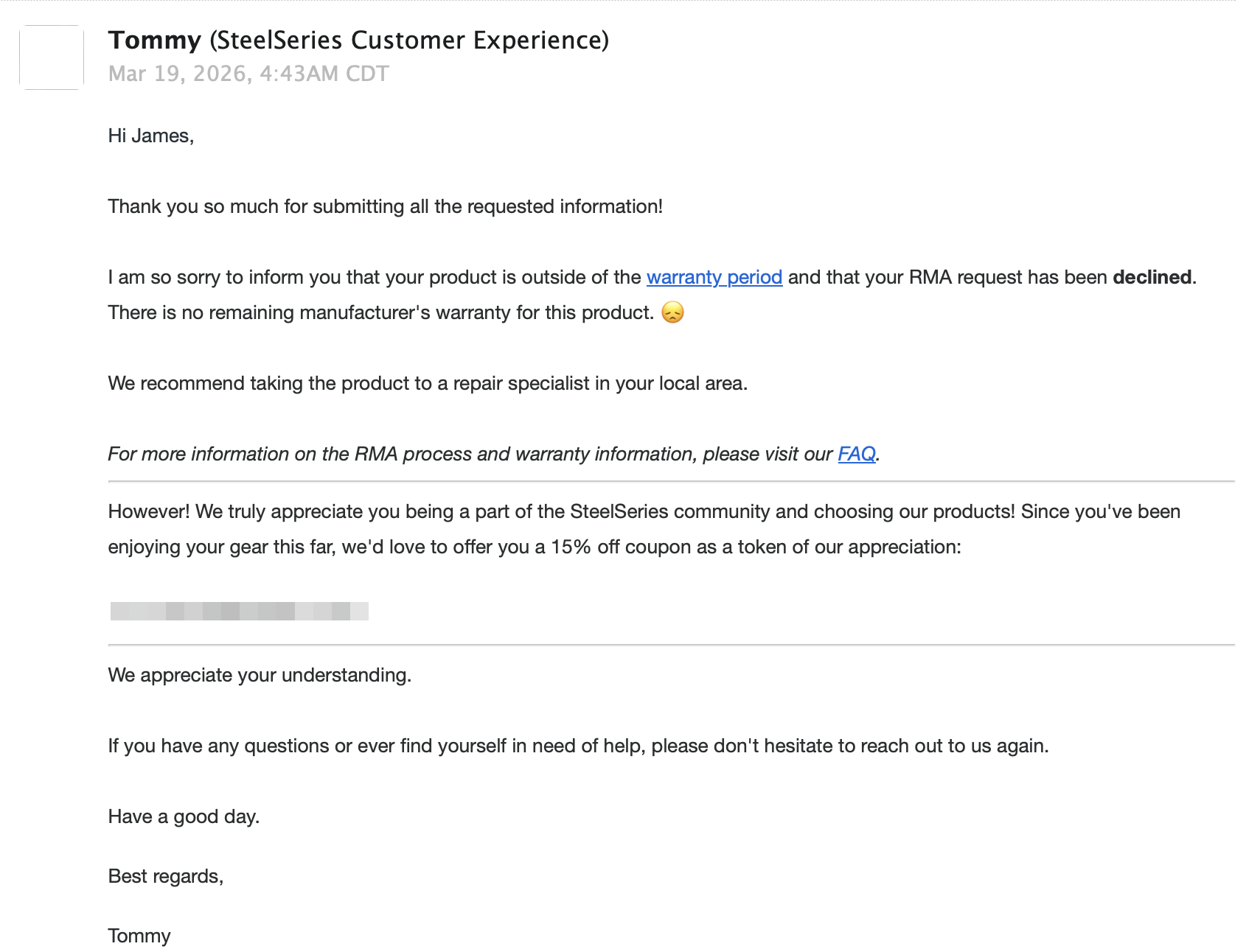 Yes, the “warranty period” link in the email goes to the exact same page that gives zero details on a term limit for the warranty, thus implying the warranty is a lifetime warranty. And their response is to reject the warranty while offering a meager 15% coupon to buy more of their garbage.